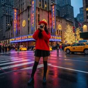This look is both festive and playful—great for Christmas photos near Radio City or ice-skating at Bryant Park.