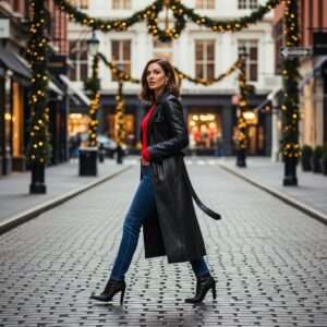 For a sleek city look, wear a leather trench coat layered over a red knit top. Add dark denim jeans and heeled black boots.