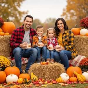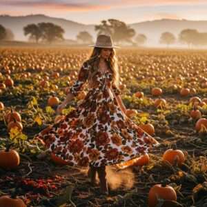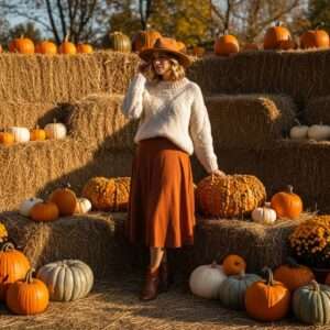 Opt for earthy tones like rust, olive, or cream to match the pumpkin patch setting.