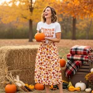 A fall-themed graphic tee (think “Pumpkin Spice Season” or “Hello Fall”) looks adorable tucked into a patterned maxi or midi skirt.