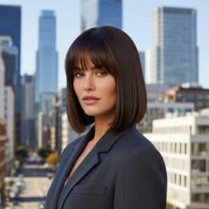 The blunt bob paired with curtain bangs adds structure and drama while keeping things balanced.