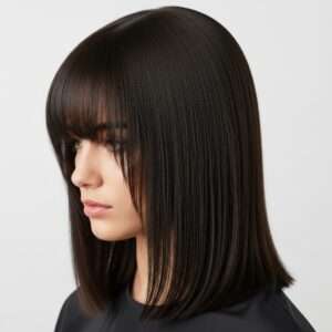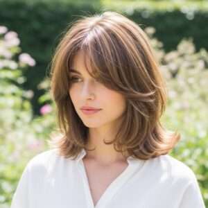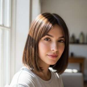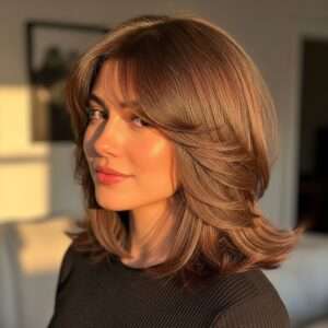 Sleek, straight shoulder-length hair with curtain bangs gives a clean, sophisticated vibe.