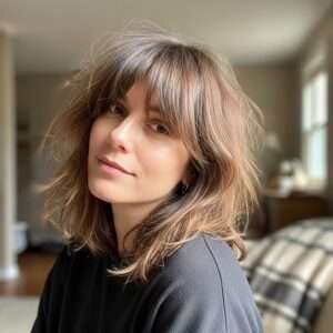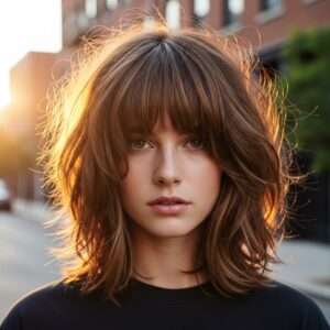 The tousled texture makes it look effortless yet stylish, and the bangs help frame the face without looking too heavy.