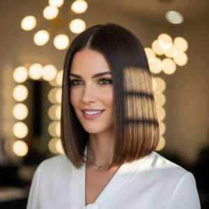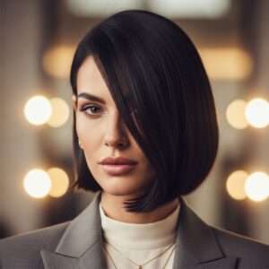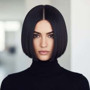 With sharp ends and no layers, it creates a sleek and structured silhouette. It’s ideal for straight hair and looks amazing with a center part.