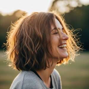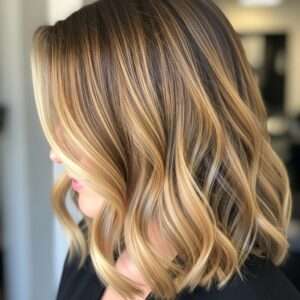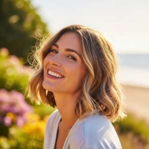 Soft waves on shoulder-length hair bring an effortless, beachy charm.