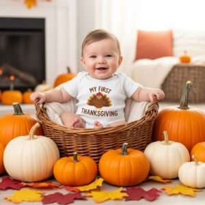 Look for designs with adorable sayings like “Gobble ‘Til You Wobble” or “My First Thanksgiving” in fall colors.