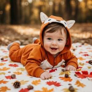 A fox or bear-themed onesie or sweatshirt set adds an extra dose of cuteness.