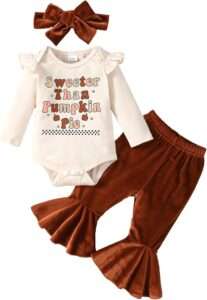 With its stretchy flare pants, cozy long-sleeve romper, and matching headband, this set makes a charming and comfortable choice for Thanksgiving parties, family gatherings, or holiday photos.