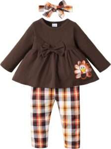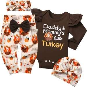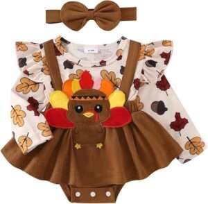 With a matching headband to complete the look, this outfit is ideal for Thanksgiving gatherings, family photos, or your baby’s first holiday celebration.