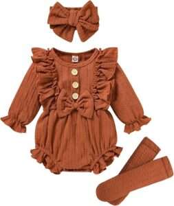Whether you’re planning to dress her in soft autumn hues, a cute pumpkin romper, or a festive dress with ruffles and bows, there are so many charming options to make her shine this holiday season.