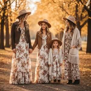 Add floral patterns or embroidered details to make your outfits stand out without losing the cozy family charm.