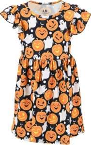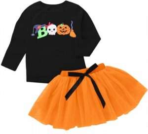 With its long-sleeve orange top and lace tutu skirt featuring cute pumpkin and ghost prints, it’s a playful yet cozy choice for fall celebrations.