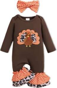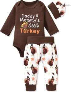 With its cute turkey print and festive design, this outfit is ideal for Thanksgiving parties, family photos, or as a thoughtful baby gift that captures the spirit of the season.