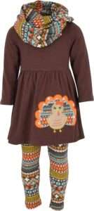 With its warm fall colors, matching leggings, and scarf, this outfit is ideal for the pumpkin patch, family photos, or Thanksgiving dinner—making it a standout choice for your little girl’s autumn wardrobe.