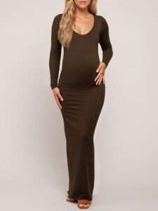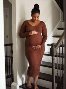 This ribbed knit maternity dress is the perfect Thanksgiving outfit for pregnant women because its soft, stretchy, and breathable fabric keeps you cozy while flattering your growing belly.
