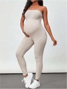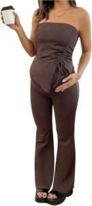 This ribbed knit two-piece maternity outfit is the perfect Thanksgiving choice because its soft, stretchy fabric ensures a comfortable and flattering fit for your growing belly.