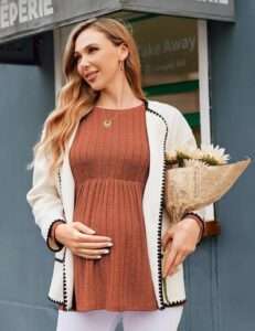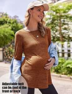 This long sleeve maternity shirt is an ideal Thanksgiving outfit for pregnant women because its soft, stretchy, and breathable fabric keeps you warm and comfortable throughout the day.