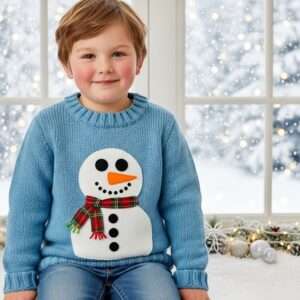 Use a white or light-blue sweater and attach felt snowman features — carrot nose, black eyes, and buttons.