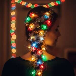 Wrap your hair in festive garland! Use small strands of tinsel or garland and intertwine them with your hair for a shiny, sparkling finish.