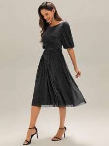 Choosing this shimmer glitter midi dress is the best choice for a winter wedding guest because its soft, stretchy fabric and elegant design combine comfort with timeless sparkle.