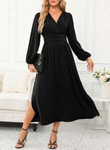 Choosing this ANRABESS deep V-neck maxi dress is the best choice for a winter wedding guest because its soft, stretchy polyester-spandex blend offers just the right balance of comfort, warmth, and elegance.