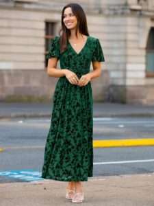 Choosing this wrapped velvet maxi dress is the best choice for a winter wedding guest because its lightweight stretch velvet fabric feels luxuriously soft, hugs your curves beautifully, and keeps you warm and comfortable.