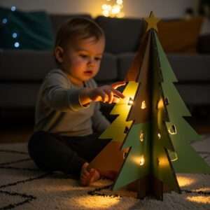 Create a soft-glow toddler-safe sensory tree using a cardboard cutout with battery-operated LED lights poking through the holes.