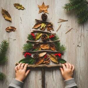 Once inside, help your toddler arrange the items into a Christmas tree shape on paper or a tray.