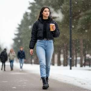 When the weather’s cold, go for a cropped puffer jacket with your favorite pair of jeans.