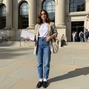 A fitted basic tee tucked into jeans, topped with a casual blazer, gives off confident, stylish vibes.