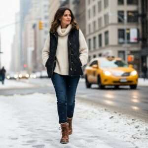 A quilted vest layered over a chunky sweater, paired with jeans or leggings, creates a functional yet stylish street outfit.
