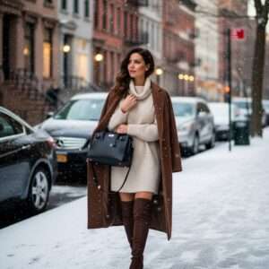 A cozy turtleneck sweater dress paired with over-the-knee boots is stylish yet practical.