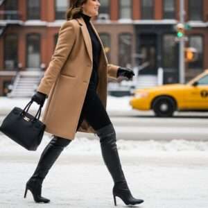 A timeless camel coat with a fitted turtleneck, skinny jeans, and knee-high boots is a classic NYC winter street style outfit.