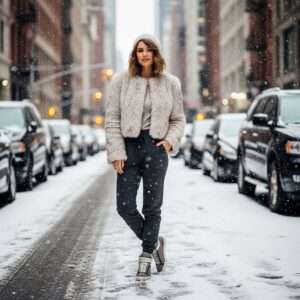 A cropped faux fur jacket paired with joggers and sneakers creates a chic, casual winter street look.