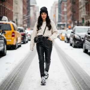 This look blends edgy and casual elements, ideal for downtown NYC winter streets.