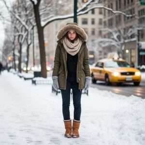 A parka with a fur-lined hood is perfect for extreme cold. Combine with leggings or skinny jeans and sturdy boots for a practical street style that’s winter-ready.