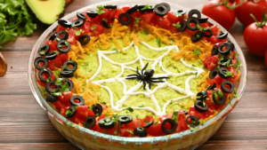Layered dips are always a crowd-pleaser, and you can make one fit the Halloween theme by turning sour cream into a spider web design.