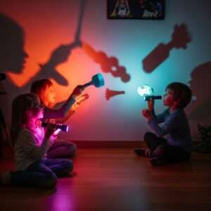 Using a flashlight, colored lights, or a simple lamp, children can observe shadows, reflections, and shapes.