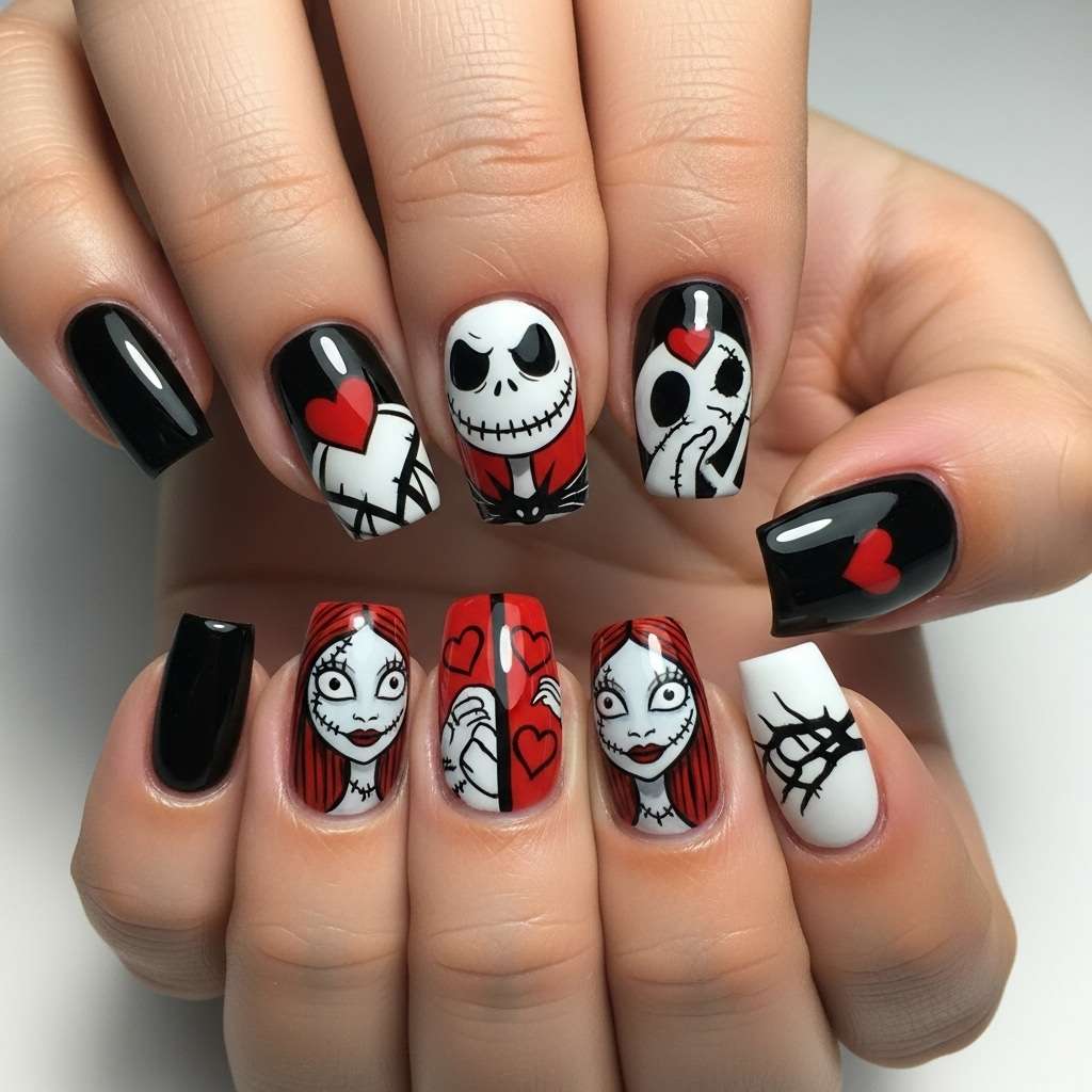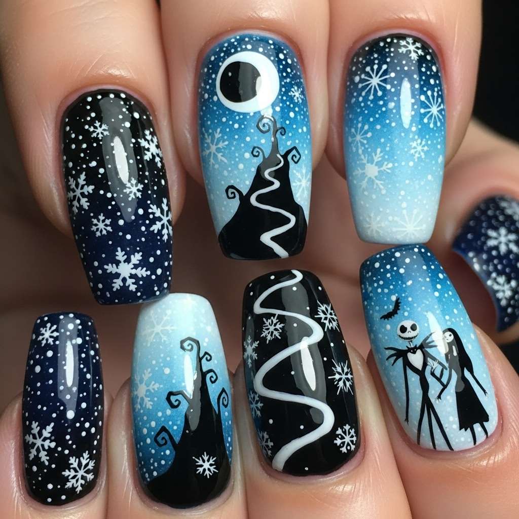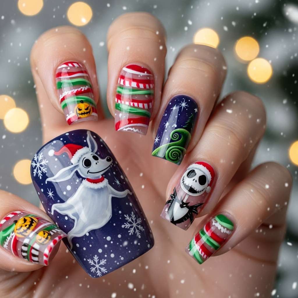 If you’re obsessed with Tim Burton’s The Nightmare Before Christmas and can’t decide between spooky Halloween or cheerful Christmas nails