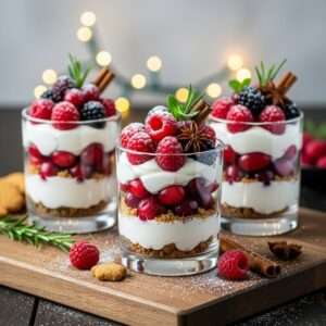 Layers of sweetened cream, fresh red and green berries, and crunchy granola create a colorful, Instagram-worthy treat that’s perfect for holiday parties, family gatherings, or a simple seasonal snack.