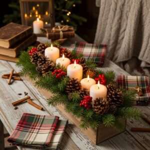 Fill a long wooden box with evergreen branches, pinecones, berries, and candles.