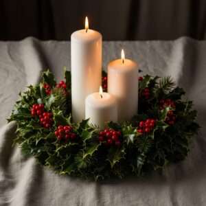 For a simple yet timeless setup, group three different-sized candles together and surround them with a wreath of holly leaves, berries, and pine sprigs.