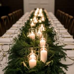 The soft candlelight reflecting off the greenery creates a warm and romantic winter glow — perfect for evening receptions.