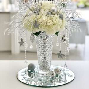 Combine white hydrangeas, silver ornaments, and frosted branches in a tall vase.