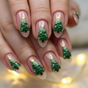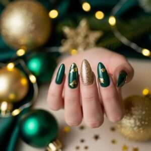 Deep emerald nails with gold foil flakes or glitter tips add a luxurious holiday feel.