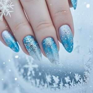 Mix soft blue shades with silver chrome tips or snowflake designs.
