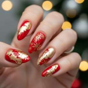Paint your almond nails with a glossy red base and add gold foil or glitter accents on one or two nails.