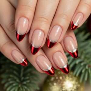 French tips meet Christmas glam! Instead of the classic white, opt for metallic red tips with a glitter outline.