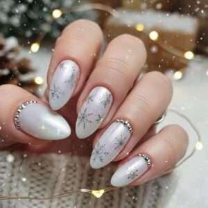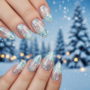 For a snow-inspired look, go for frosty white almond nails with iridescent glitter.
