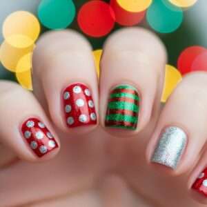 For a quick and simple design, go with full glitter nails in red, green, or silver.